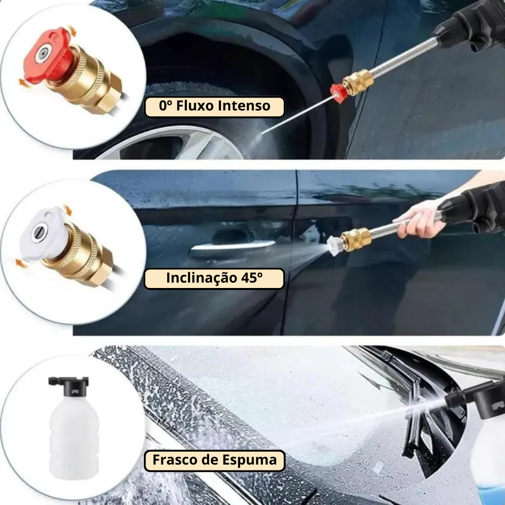 - Versatilidade ilimitada: cablagem, pilhas, pressão ajustável e acessórios incluídos, tudo concebido para facilitar cada limpeza.