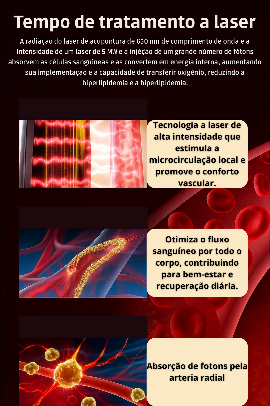 Tecnologia laser que estimula a circulação e melhora a fluidez sanguínea.